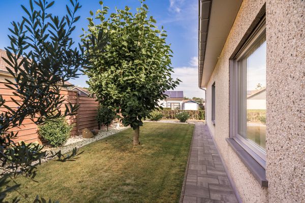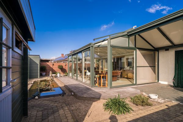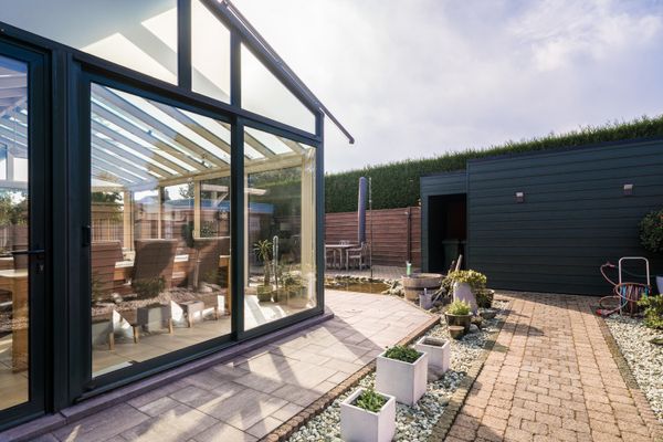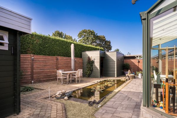 De eigenaars hebben de tuin volledig aangelegd, zo vinden we hier 2 afgewerkte bergingen, een aangelegde oprit dat plaats bied voor 2 wagens en een onderhoudsvriendelijke tuin met aangename vijver.